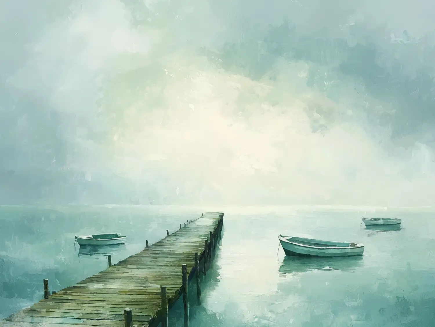 Paisaje marino que presenta un muelle de madera que se extiende hacia el horizonte, rodeado de aguas tranquilas y botes anclados. El cielo muestra tonos suaves y difusos, creando una atmósfera de calma y serenidad. La obra utiliza una paleta de colores sutiles que enfatiza la conexión entre el agua y el cielo, invitando a la contemplación y reflexión. Esta representación es característica de un estilo contemporáneo que busca capturar la esencia de la naturaleza en su forma más pura.