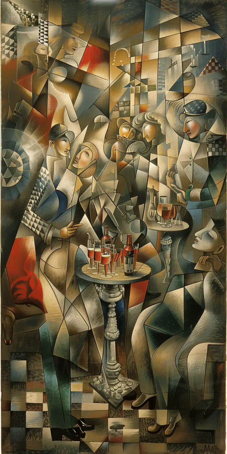Obra que representa una reunión social con varias figuras humanas en un entorno dinámico. Los personajes interactúan alrededor de mesas con bebidas, creando una atmósfera de celebración. La composición utiliza formas geométricas y colores contrastantes, reflejando el estilo del cubismo. La obra destaca por su uso de líneas y planos que fragmentan la realidad, ofreciendo una visión moderna de la vida social en el siglo XX.
