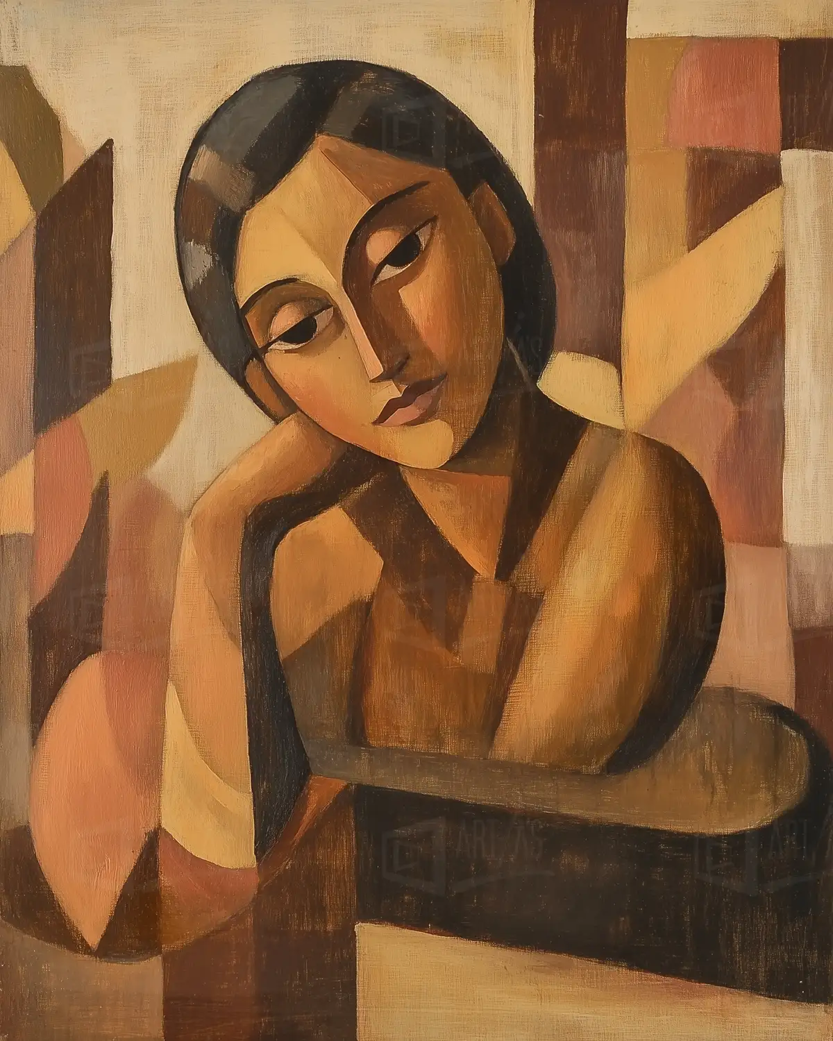 Retrato de una mujer que presenta una expresión introspectiva, rodeada de un fondo abstracto en tonos cálidos. La obra utiliza formas geométricas y líneas suaves para crear un efecto de profundidad y volumen. La paleta de colores predominante incluye marrones y ocres, que aportan calidez y un sentido de serenidad. Esta obra refleja influencias del cubismo y el arte moderno, destacando la simplificación de las formas y la exploración de la figura humana en un contexto abstracto.
