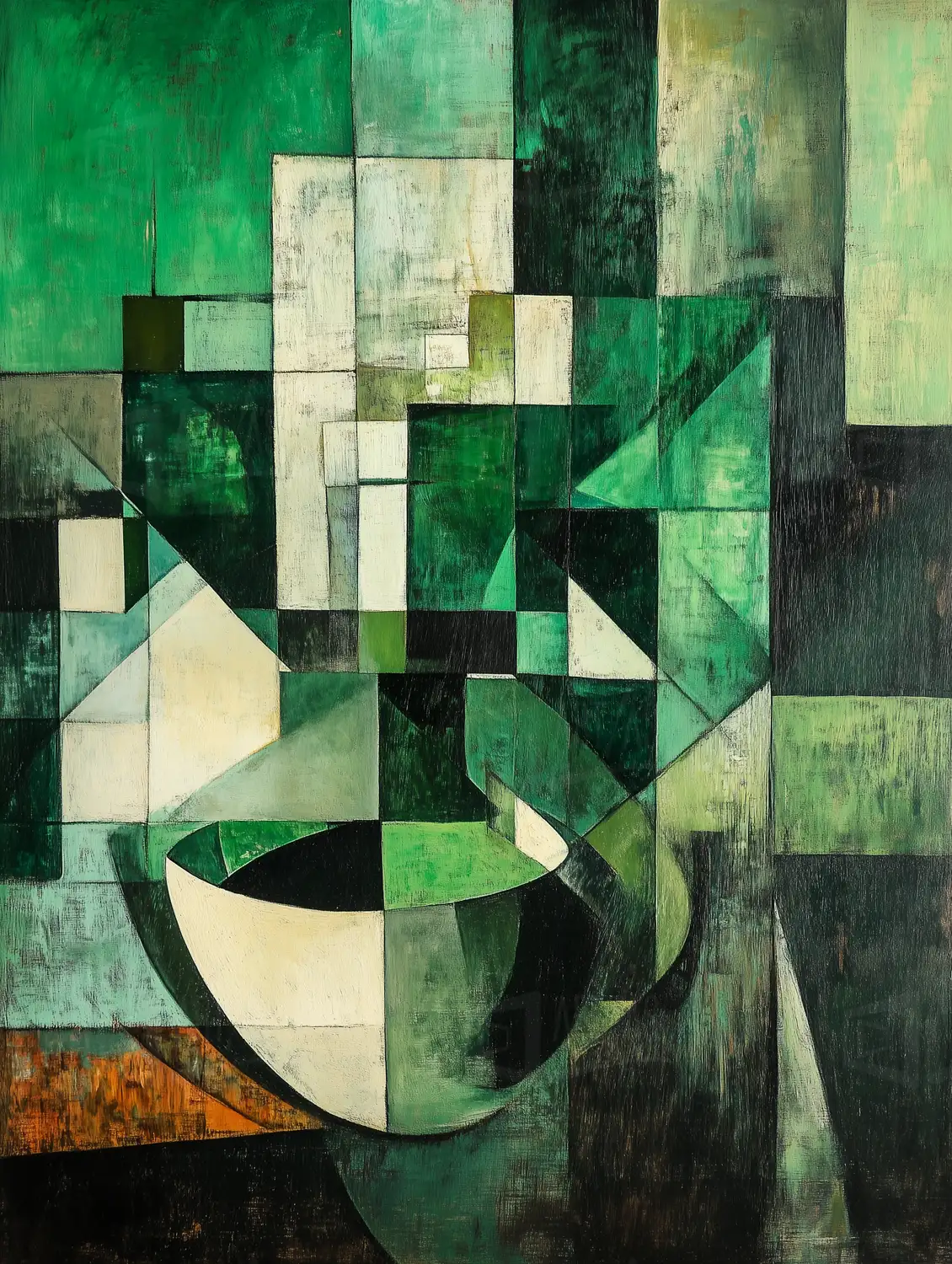 Obra abstracta que presenta una serie de formas geométricas organizadas en un patrón dinámico. Predominan los tonos verdes, que van desde el claro hasta el oscuro, junto con elementos en blanco y marrón. La disposición de los bloques y la variedad de tonalidades crean una sensación de profundidad y movimiento, reflejando influencias del cubismo. Esta obra se sitúa en el contexto del arte contemporáneo, explorando la relación entre color y forma.