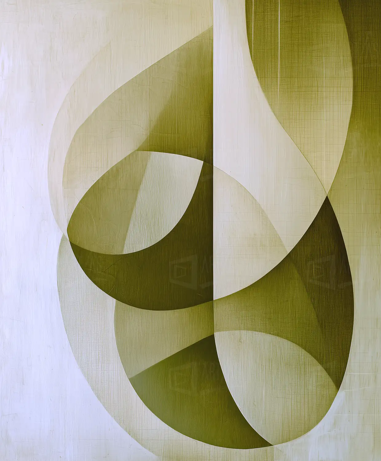 Composición abstracta con formas geométricas en tonos verdes y blancos.