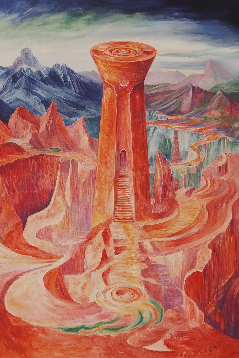 Obra que presenta un paisaje surrealista dominado por una torre roja en el centro, rodeada de formaciones rocosas en tonos cálidos. El fondo muestra montañas y un cielo dramático, creando una atmósfera de misterio y exploración. La composición destaca por su uso de líneas fluidas y formas orgánicas, invitando al espectador a interpretar el significado detrás de la estructura y el entorno. Esta obra refleja influencias del surrealismo y se sitúa en un contexto contemporáneo.
