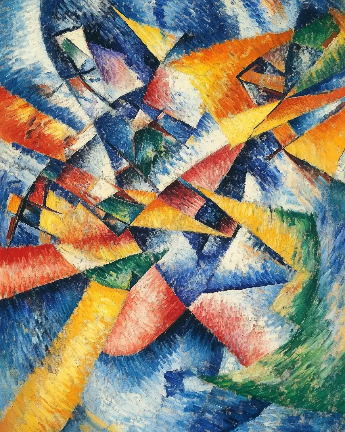 Obra abstracta que presenta una explosión de formas geométricas en una variedad de colores vibrantes. La disposición dinámica de los elementos sugiere movimiento y energía, caracterizando el estilo del arte moderno. La interacción entre los colores azul, amarillo, rojo y verde crea un contraste visual que atrae la atención del espectador. Esta obra refleja las tendencias del siglo XX, donde la abstracción y la experimentación con la forma y el color son predominantes.