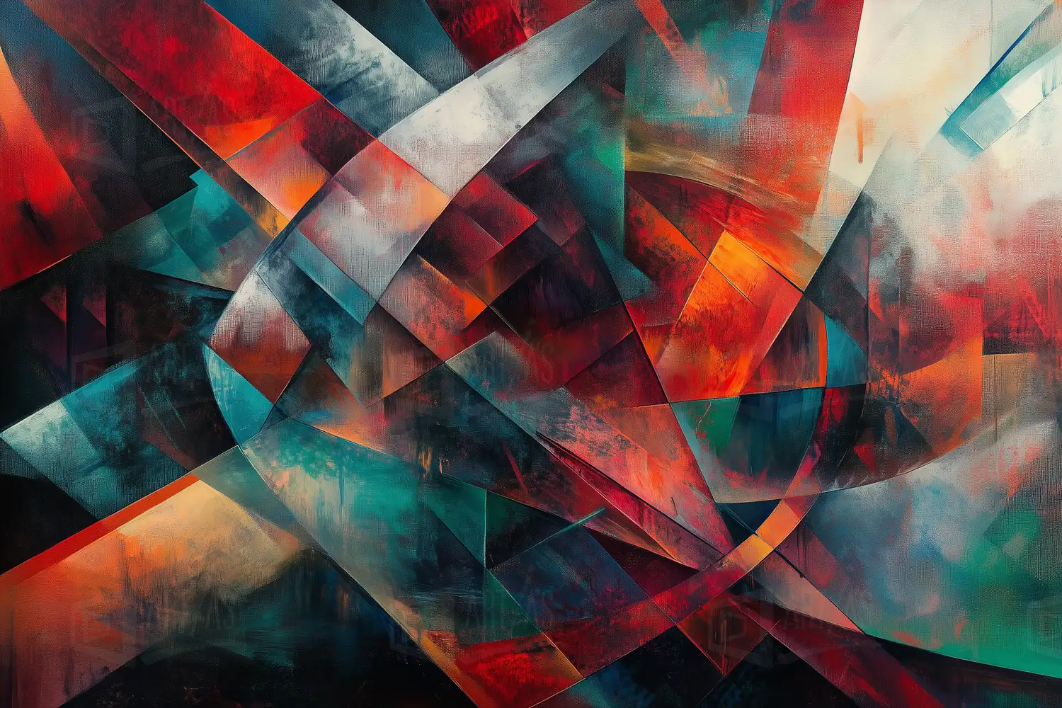 Obra abstracta que presenta una compleja disposición de formas geométricas en una paleta de colores vibrantes. Los tonos de rojo, azul y negro se entrelazan, creando un dinamismo visual. La interacción de las formas y colores sugiere movimiento y profundidad, invitando al espectador a explorar la relación entre los elementos. Esta obra refleja influencias del cubismo y el expresionismo, destacando la experimentación con la forma y el color en el arte contemporáneo.