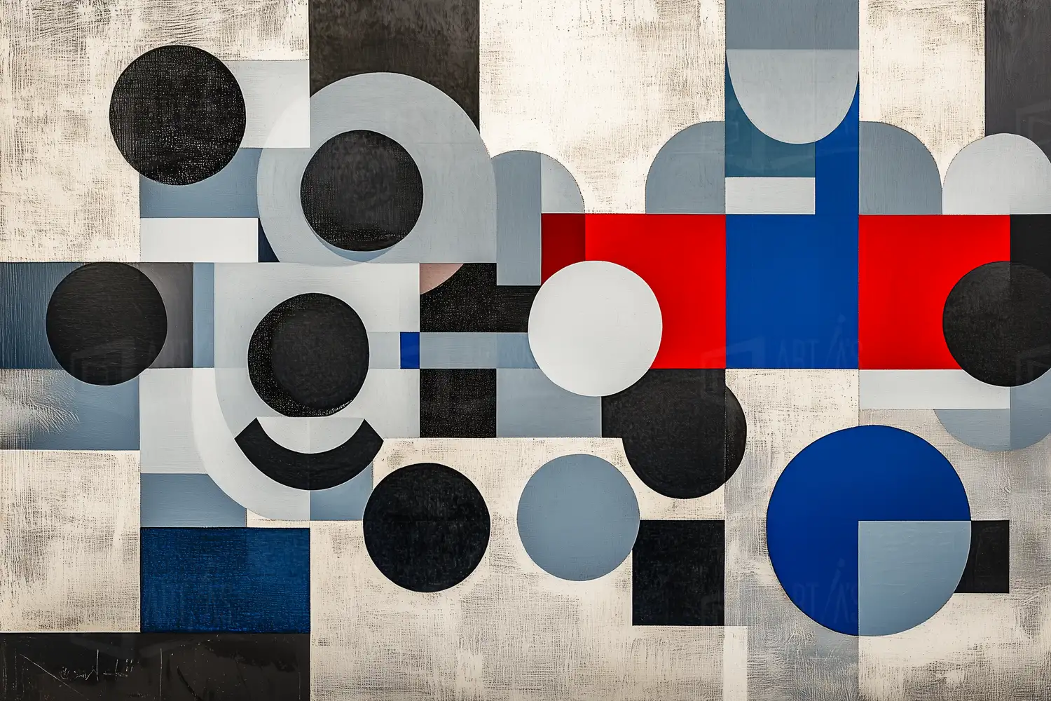 Obra abstracta que presenta una disposición de formas geométricas, incluyendo círculos y rectángulos en una paleta de colores que incluye negro, blanco, azul y rojo. La interacción entre las formas y los colores crea un dinamismo visual, característico del arte moderno. Esta obra refleja la exploración de la geometría y el color, típica de movimientos artísticos del siglo XX, como el cubismo y el constructivismo.