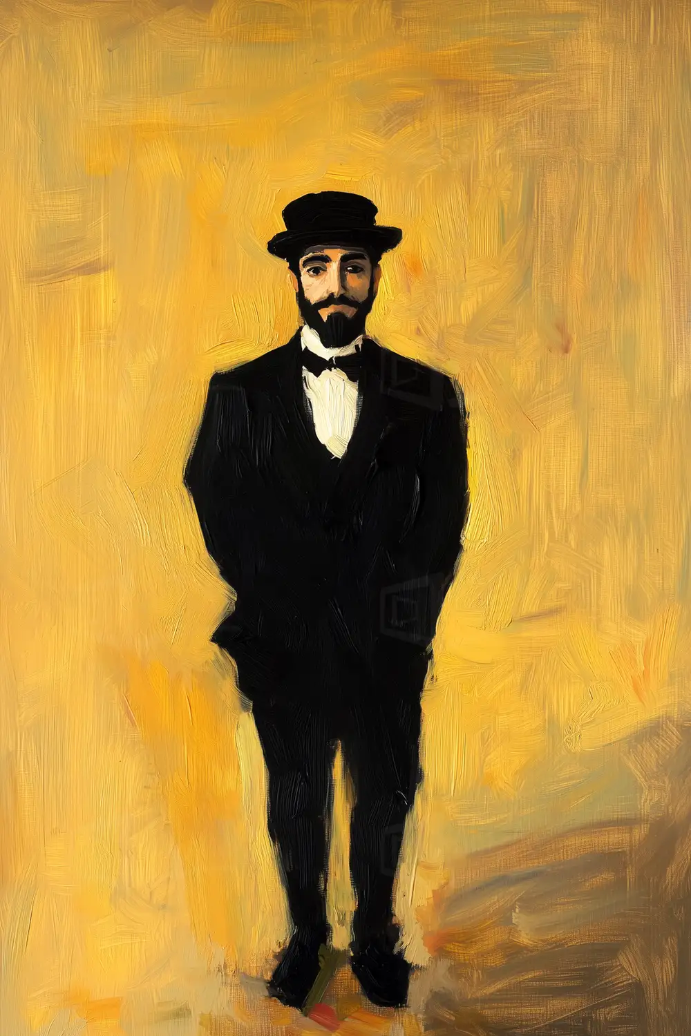 Retrato de un hombre de pie, vestido con un traje oscuro y un sombrero de copa. Su expresión es seria y se encuentra en el centro de la composición, destacando sobre un fondo amarillo que aporta luminosidad a la obra. La técnica utilizada sugiere pinceladas sueltas y una paleta de colores contrastantes, lo que añade dinamismo a la representación. Esta obra refleja características del arte contemporáneo, con un enfoque en la figura humana y el uso del color para crear atmósferas específicas.