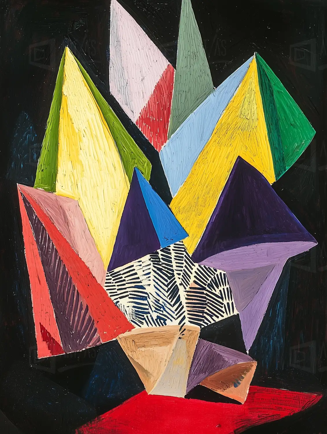 Obra abstracta que presenta una serie de formas geométricas en colores vibrantes, como amarillo, verde, azul y rojo, dispuestas de manera dinámica sobre un fondo negro. La disposición de los elementos crea un sentido de movimiento y energía, mientras que las texturas visibles en la pintura añaden profundidad. Esta obra refleja influencias del arte moderno, destacando la interacción entre color y forma en un contexto contemporáneo.
