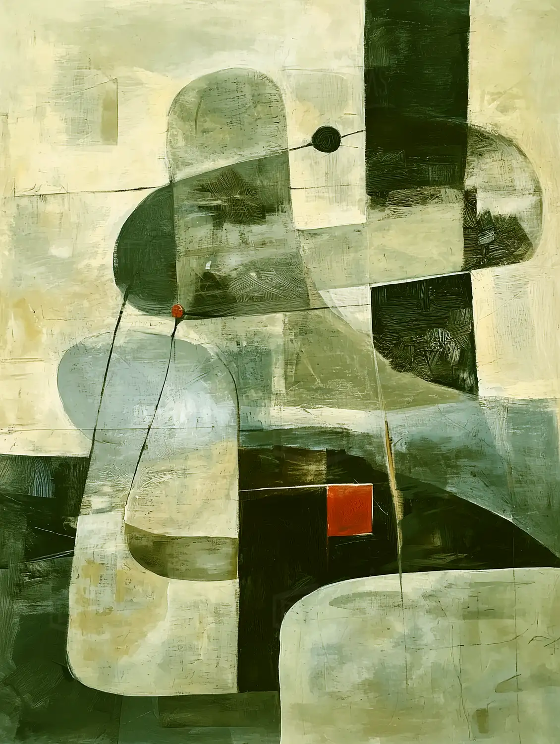 Obra abstracta que presenta una serie de formas geométricas en tonos neutros, con un uso destacado de líneas y espacios vacíos. La composición se caracteriza por la interacción de diferentes elementos, donde predominan las formas curvas y rectangulares. Un pequeño cuadrado rojo aporta un contraste visual, mientras que los tonos verdes y grises crean una atmósfera equilibrada y contemporánea. Esta obra refleja influencias del arte moderno, destacando la exploración de la forma y el color en un contexto minimalista.