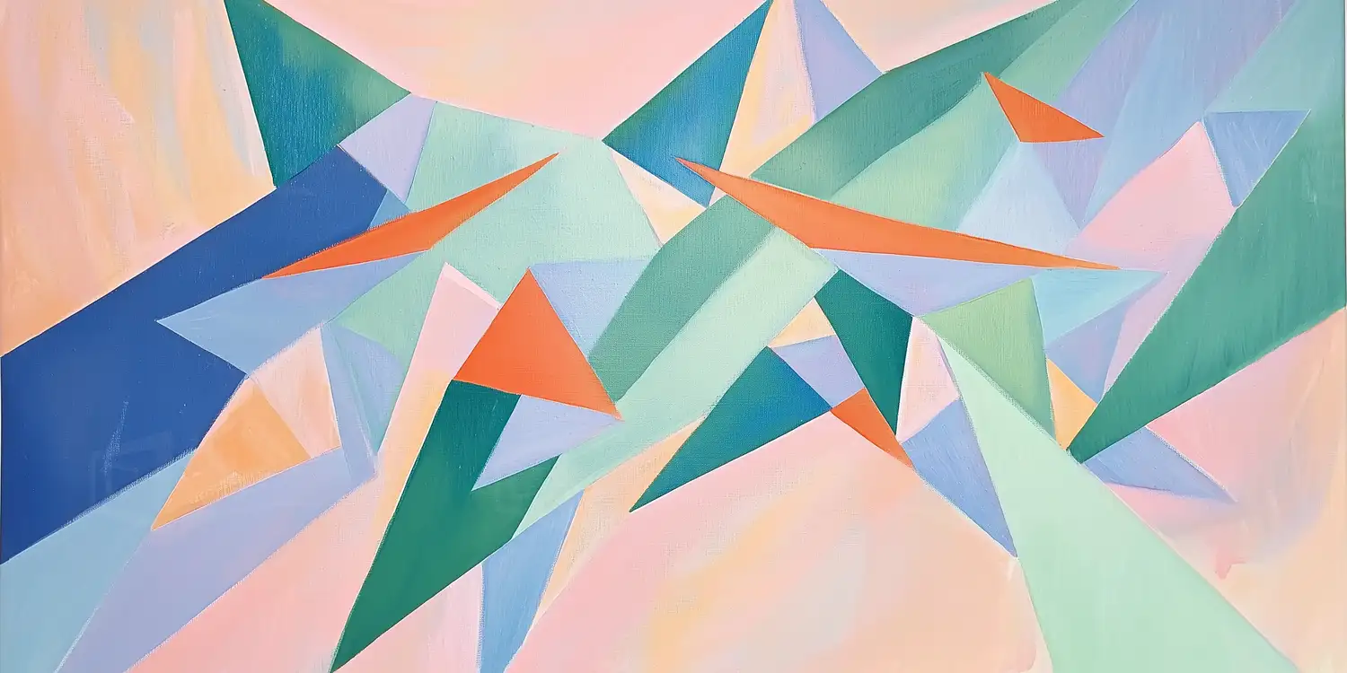 Obra abstracta que presenta una serie de formas geométricas en una disposición dinámica. Los colores predominantes incluyen tonos de azul, verde y naranja, creando un contraste visual atractivo. La composición se caracteriza por la interacción de triángulos y líneas que sugieren movimiento y profundidad. Esta obra refleja influencias del arte moderno, destacando la exploración de la forma y el color en un contexto contemporáneo.