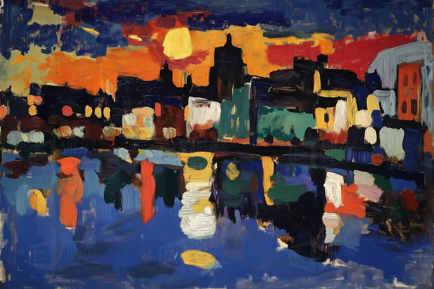 Paisaje urbano que captura un atardecer vibrante, donde los edificios se perfilan contra un cielo lleno de colores cálidos. Los reflejos en el agua añaden dinamismo a la escena, creando una atmósfera de tranquilidad y movimiento. La obra utiliza pinceladas sueltas y colores intensos, característicos de principios del siglo XX, evocando el estilo postimpresionista.