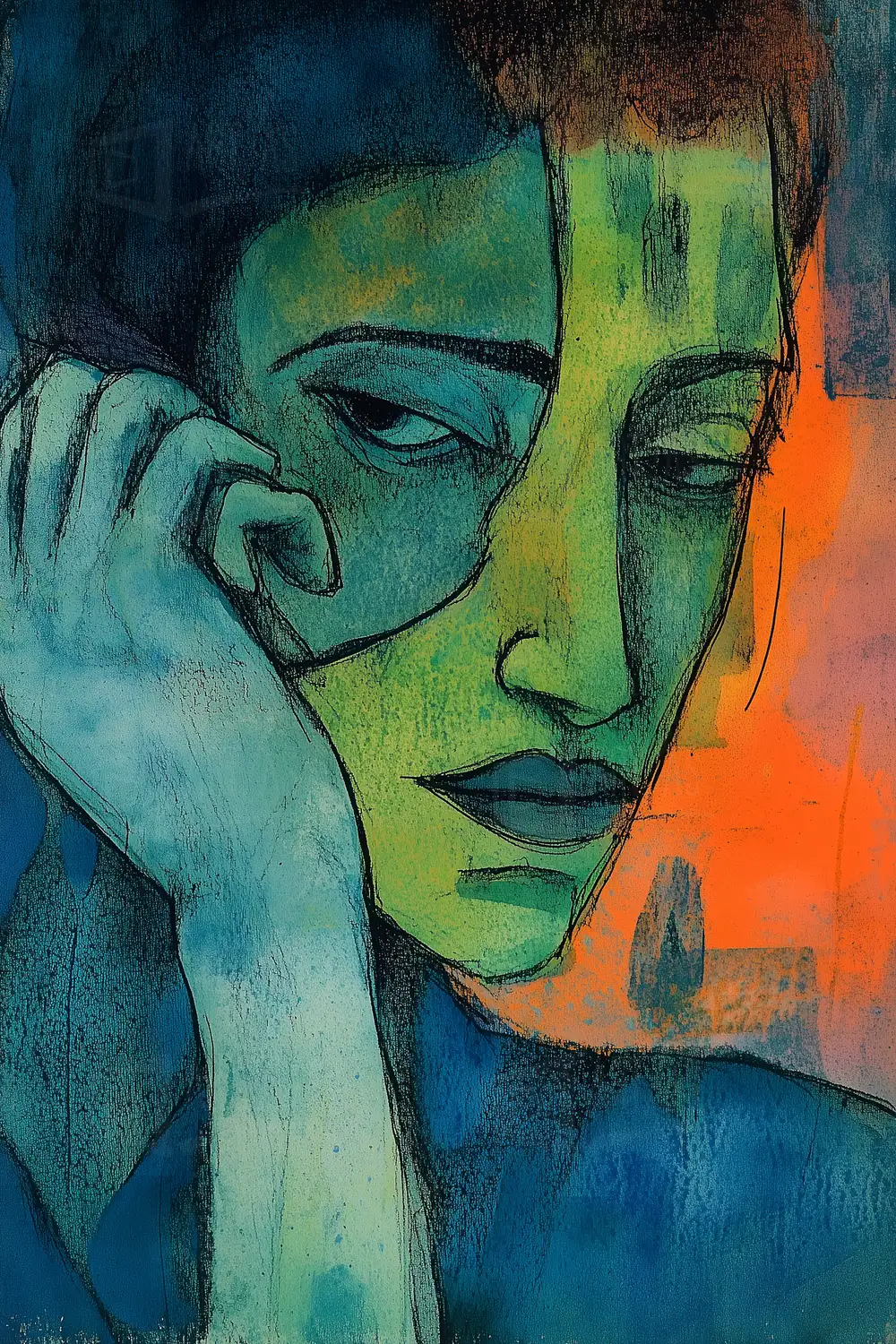 Retrato de una figura femenina que muestra una expresión introspectiva, con un uso predominante de tonos azules y verdes. El fondo abstracto, que incluye matices naranjas, contrasta con la figura, creando una atmósfera emocional. La obra refleja influencias del arte contemporáneo, utilizando técnicas de acuarela y lápiz para resaltar la profundidad y la textura de la piel. La composición se centra en la figura, invitando al espectador a reflexionar sobre su estado emocional.