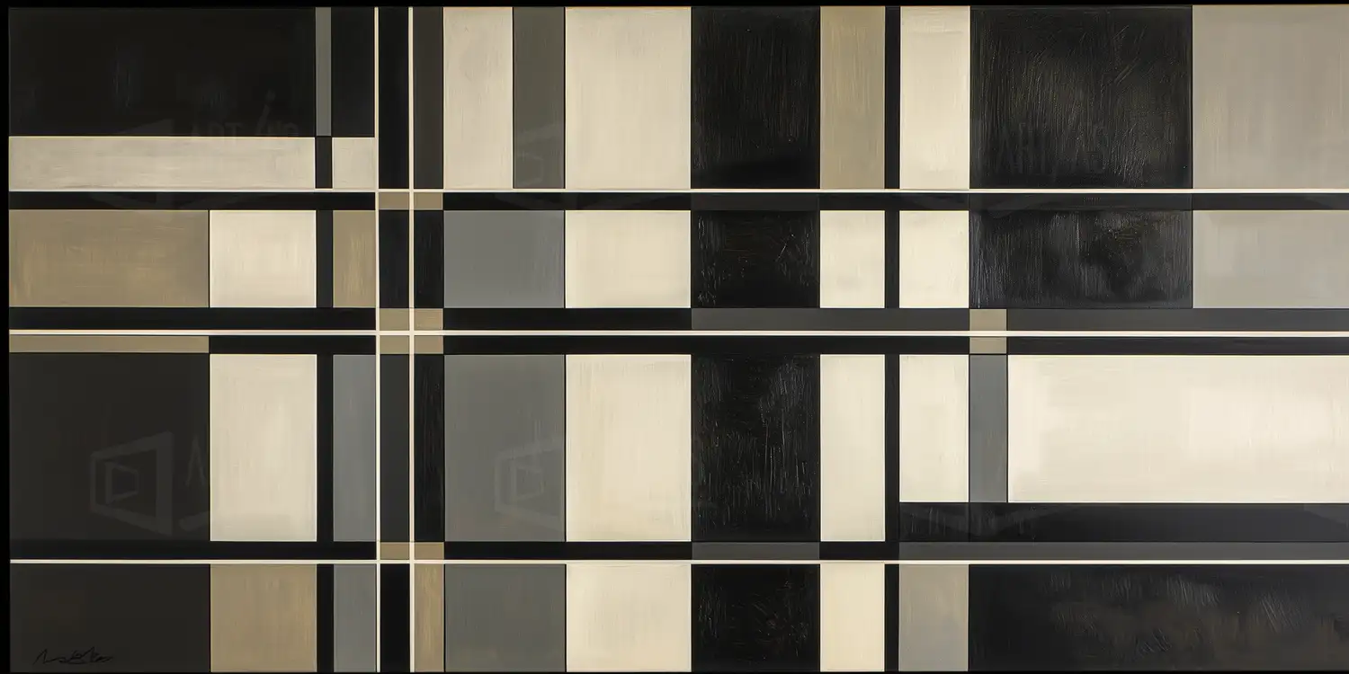 Obra abstracta que presenta una serie de formas geométricas organizadas en un patrón estructurado. Los tonos predominantes son el negro, gris y beige, creando un contraste visual que resalta la disposición de los elementos. La obra refleja influencias del minimalismo y el arte contemporáneo, utilizando líneas y bloques de color para generar un efecto visual equilibrado y dinámico. Esta pieza invita a la reflexión sobre la relación entre forma y espacio en el arte moderno.