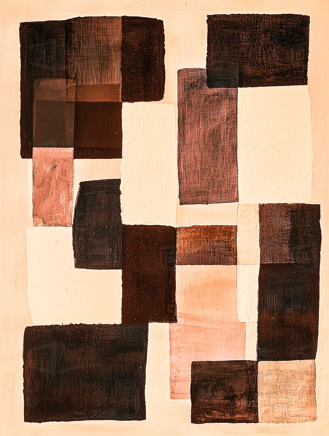 Composición abstracta con formas geométricas en tonos marrones y blancos.