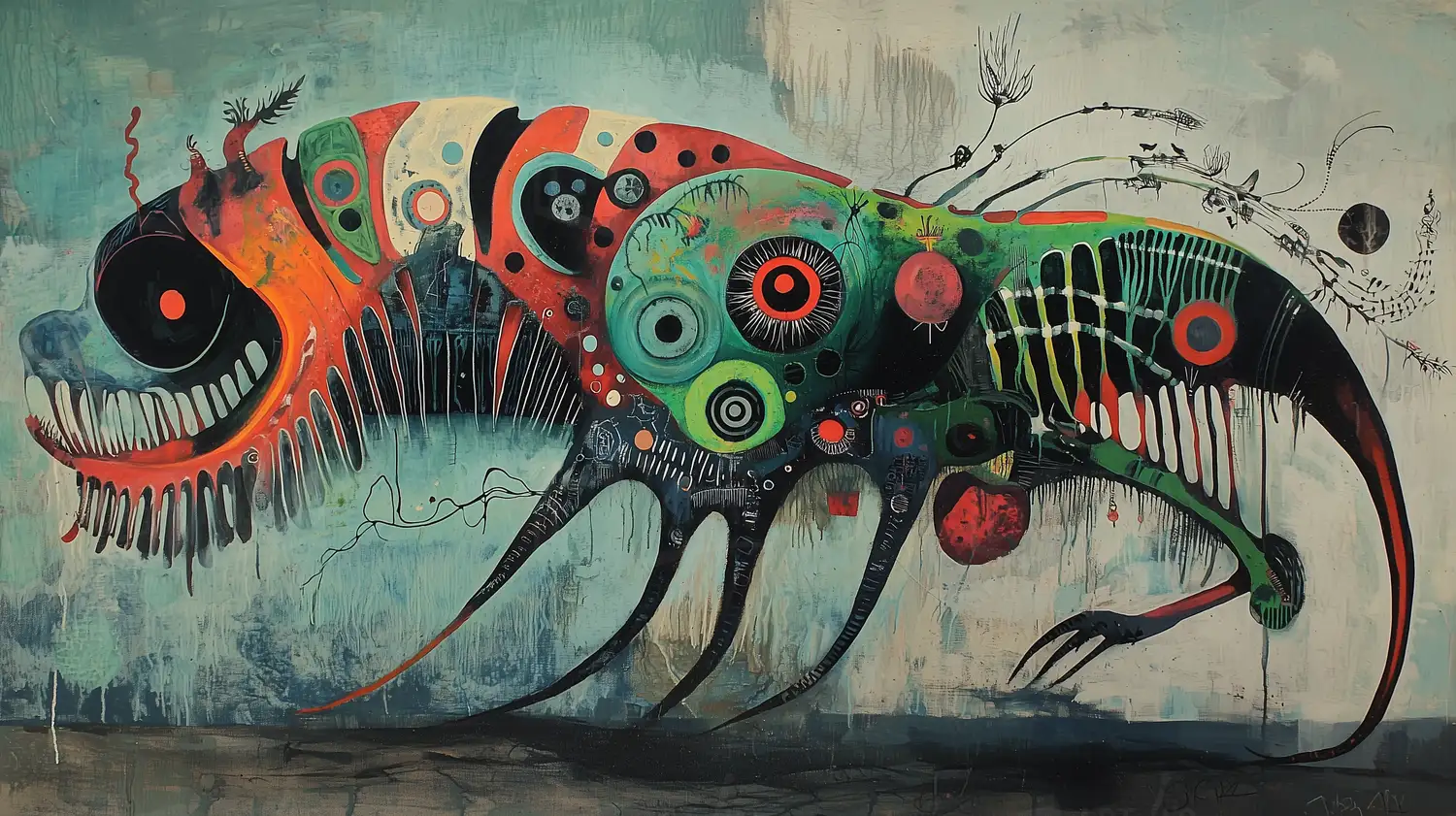 La obra presenta una criatura abstracta con un diseño que combina formas orgánicas y geométricas. Los colores vibrantes, como el rojo, verde y negro, se entrelazan en un fondo azul, creando un efecto visual impactante. Esta representación evoca una sensación de movimiento y dinamismo, destacando la interacción entre los elementos. La composición sugiere una narrativa visual que invita a la interpretación personal del espectador.