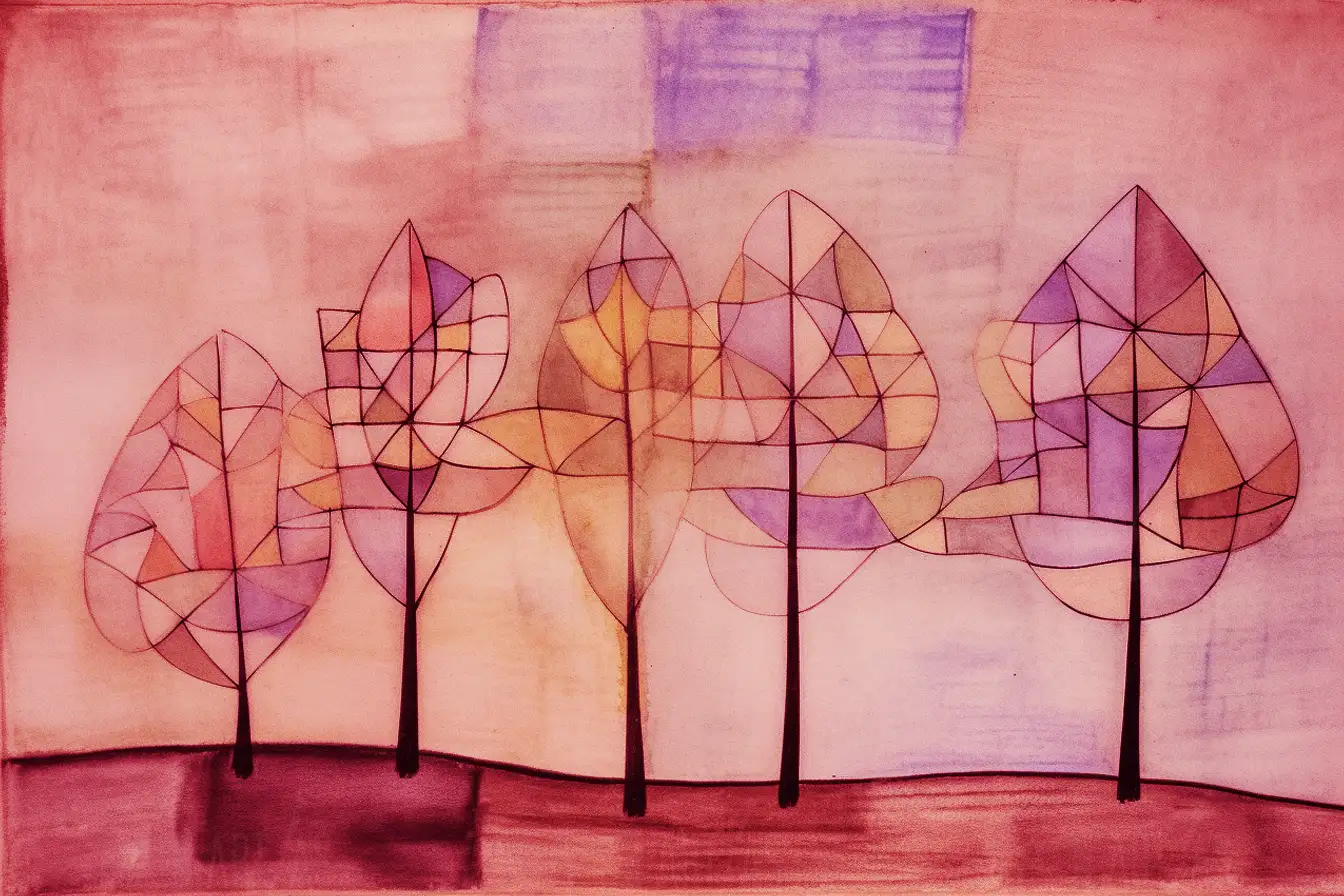 La obra presenta una representación abstracta de árboles estilizados, utilizando formas geométricas y colores suaves. Los árboles se organizan en una composición equilibrada, con un fondo que combina tonos claros y cálidos. Esta pieza destaca por su uso de líneas definidas y una paleta de colores que evoca una atmósfera tranquila y contemplativa, ideal para el análisis de la relación entre la naturaleza y la abstracción.