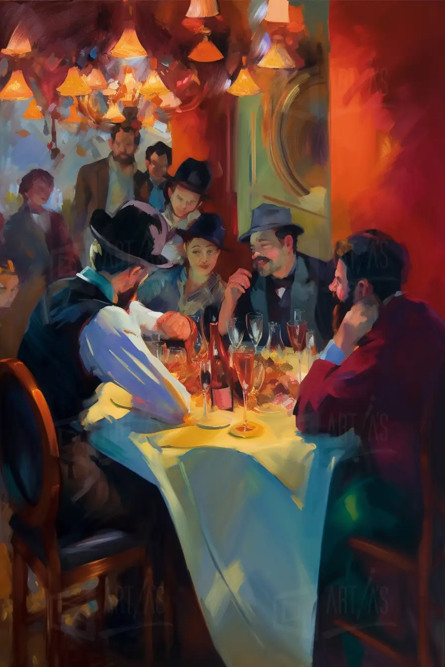 La obra representa una escena social en un ambiente acogedor, donde un grupo de personas se reúne alrededor de una mesa. Se observan conversaciones animadas y la interacción entre los personajes, todos vestidos con trajes de época. La iluminación cálida y los colores vibrantes crean una atmósfera íntima y festiva, destacando la conexión humana en un entorno social. La composición se centra en la mesa, donde se aprecian copas y botellas, simbolizando la celebración y la camaradería.