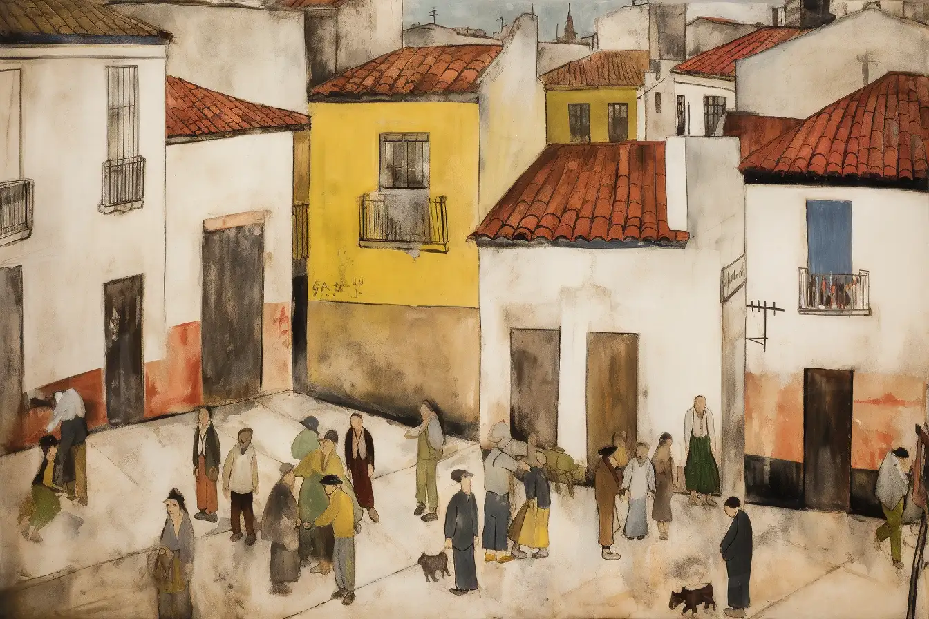 Obra que representa una escena urbana con casas de diferentes colores, destacando un edificio amarillo. En la calle, se observan varias personas interactuando, algunas caminando y otras conversando. La composición muestra un ambiente cotidiano, reflejando la vida en un barrio. Los techos de tejas rojas contrastan con las paredes blancas y amarillas, creando un efecto visual atractivo. Esta obra captura la esencia de la vida urbana y la interacción social en un entorno arquitectónico característico.