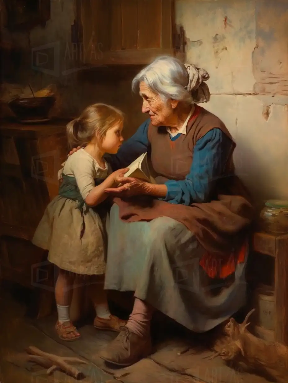 La obra representa una conmovedora escena en la que una anciana comparte un momento de lectura con una niña en un entorno rústico. La luz suave ilumina sus rostros, destacando la conexión emocional entre ambas. El fondo muestra detalles de una habitación sencilla, con elementos que sugieren una vida cotidiana. Esta representación evoca sentimientos de ternura y sabiduría, capturando la esencia de la transmisión de conocimiento y afecto entre generaciones.