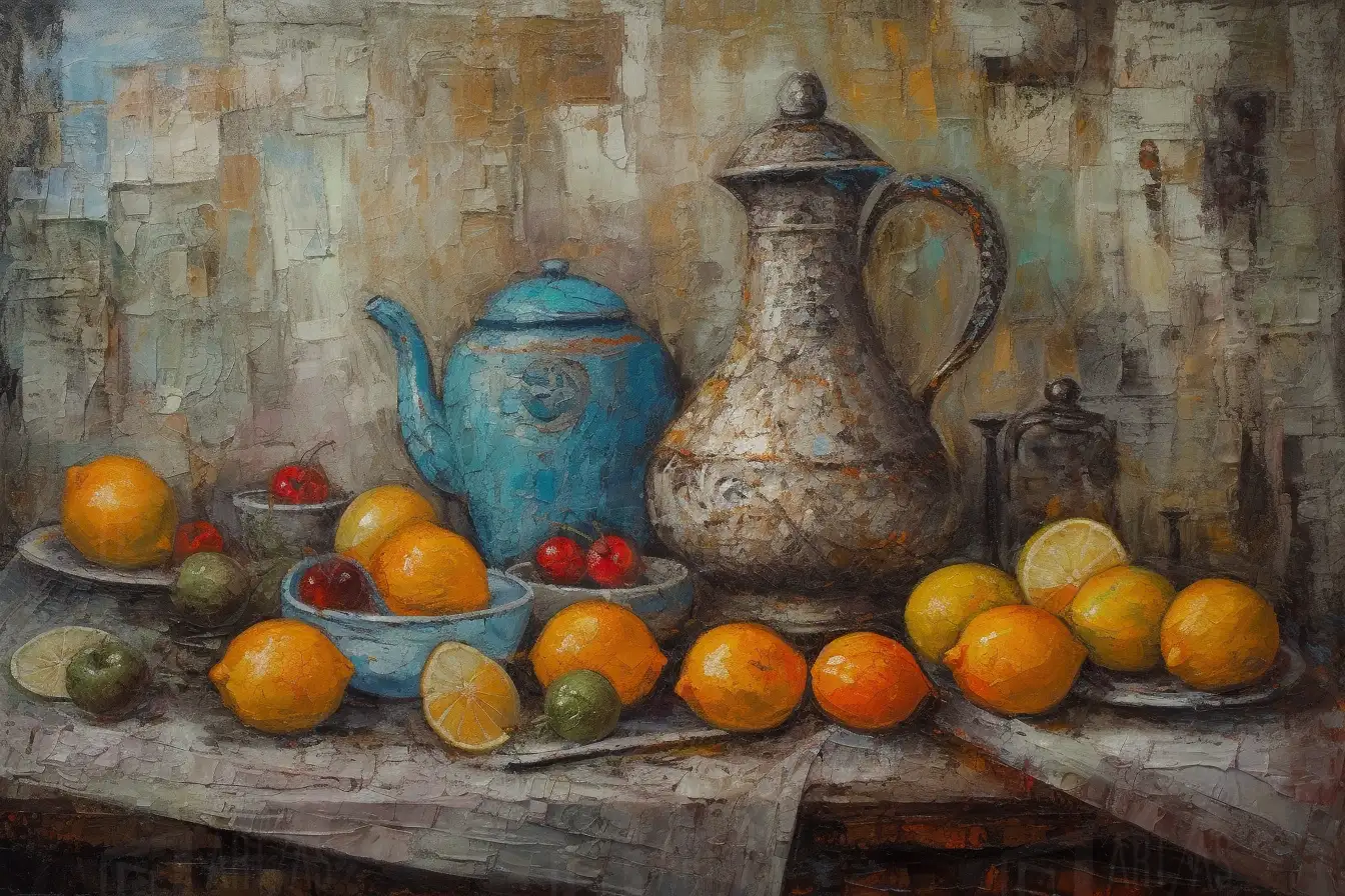 Obra que representa una naturaleza muerta con una variedad de frutas, incluyendo limones, naranjas y manzanas, dispuestas sobre una mesa. Se observan utensilios de metal, como una tetera y una jarra, que añaden un elemento decorativo. La composición destaca por el uso de colores cálidos y fríos, creando un contraste visual que resalta la frescura de las frutas y la textura de los objetos. Esta obra captura la esencia de la vida cotidiana y la belleza de los elementos simples.