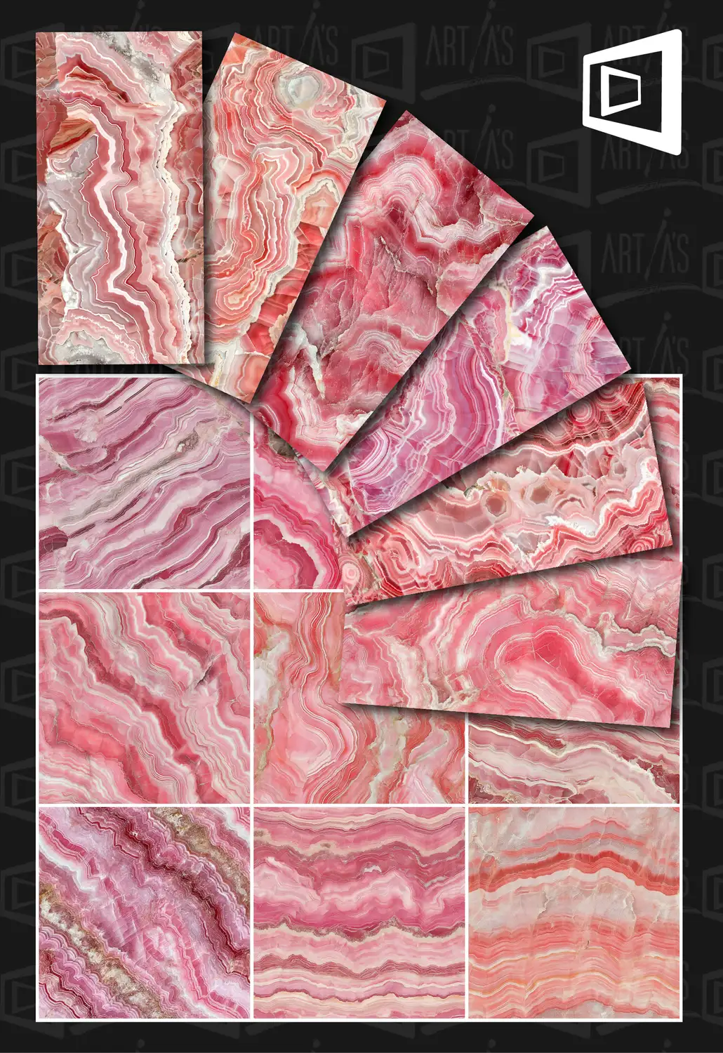 Conjunto de texturas para paneles piedra de rodocrosita, compuesto de doce piezas cuadradas y seis rectangulares todas ellas pueden ser utilizadas tanto en combinaciones aleatorias como patrones de repetición. La rodocrosita es un mineral caracterizado por sus distintivos patrones en tonos de rosa y blanco. Cada pieza muestra variaciones en la textura y el diseño, creando un efecto visual atractivo. Ideal para diseño de interiores