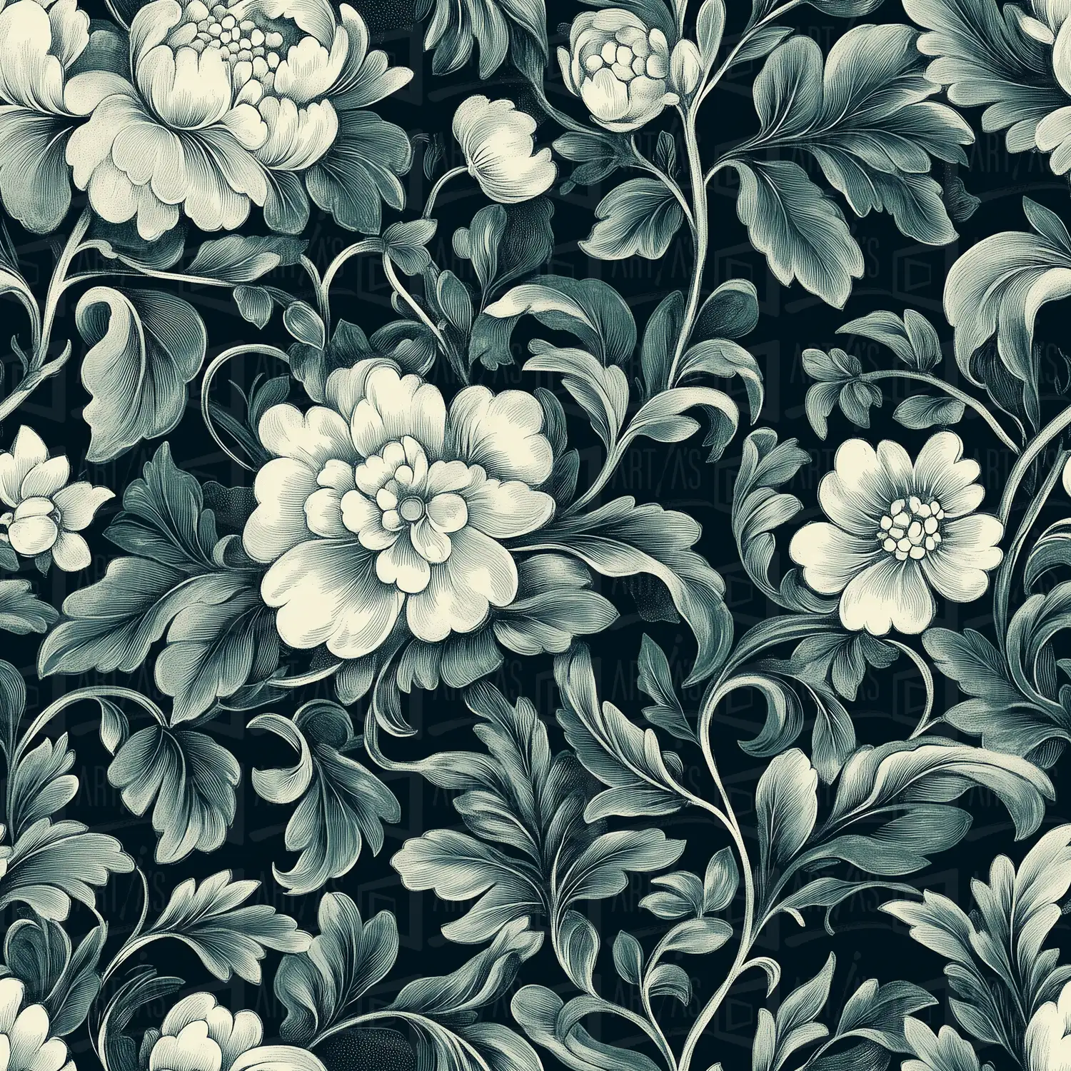 La obra presenta un patrón floral detallado, con flores y hojas en tonos claros que contrastan con un fondo oscuro. Este diseño evoca una sensación de elegancia y sofisticación, ideal para aplicaciones decorativas. Las formas orgánicas de las flores y las hojas se entrelazan, creando un ritmo visual que atrae la atención. La técnica utilizada resalta la delicadeza de los detalles, haciendo de esta obra una opción atractiva para quienes buscan un estilo clásico y refinado.