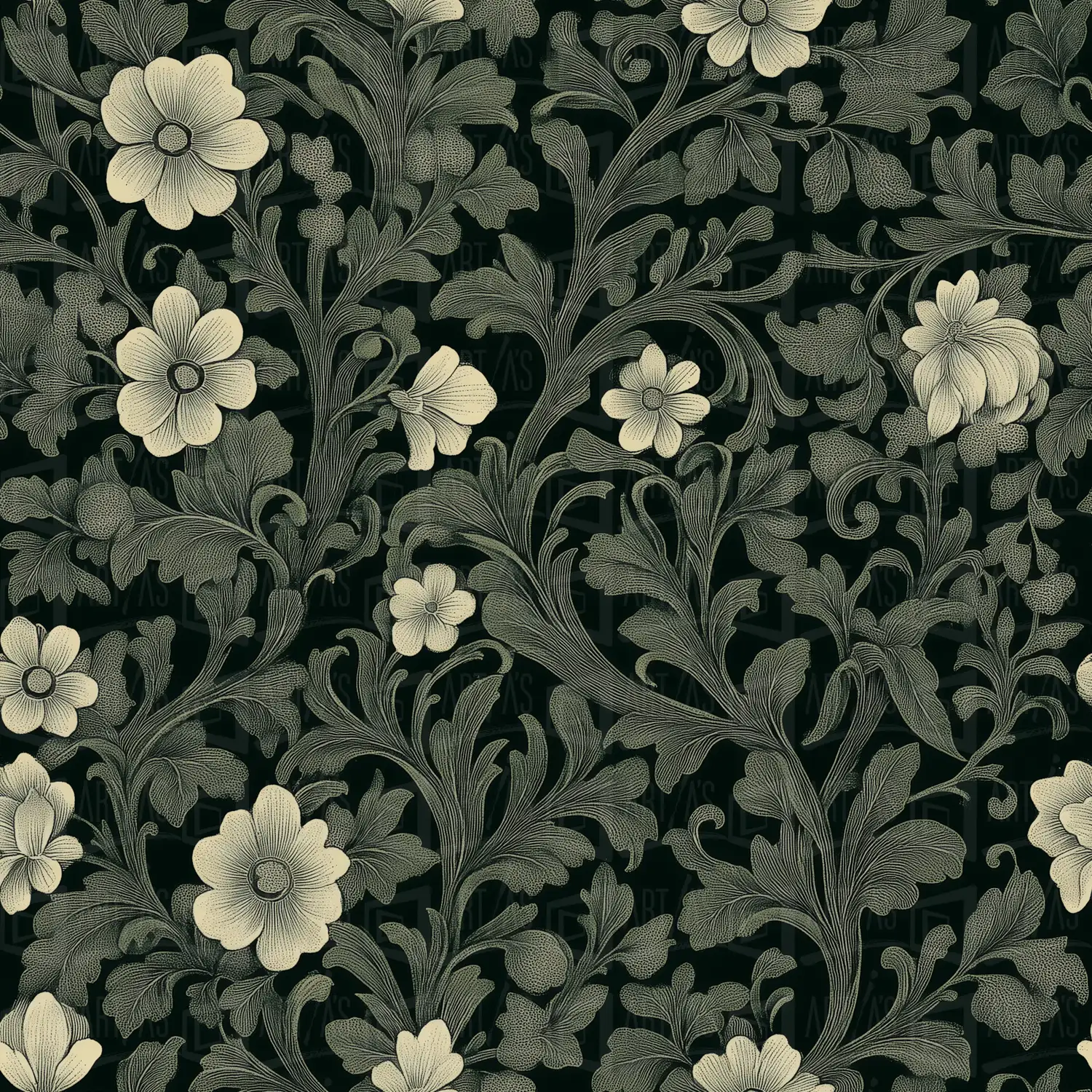 La obra presenta un patrón floral detallado, donde se destacan flores de tonos claros sobre un fondo negro. Este diseño muestra una rica variedad de hojas y flores, creando una composición armoniosa y equilibrada. La disposición de los elementos sugiere un estilo decorativo, ideal para aplicaciones en textiles o papelería. La atención al detalle en las líneas y formas resalta la belleza de la naturaleza, ofreciendo una estética elegante y sofisticada.