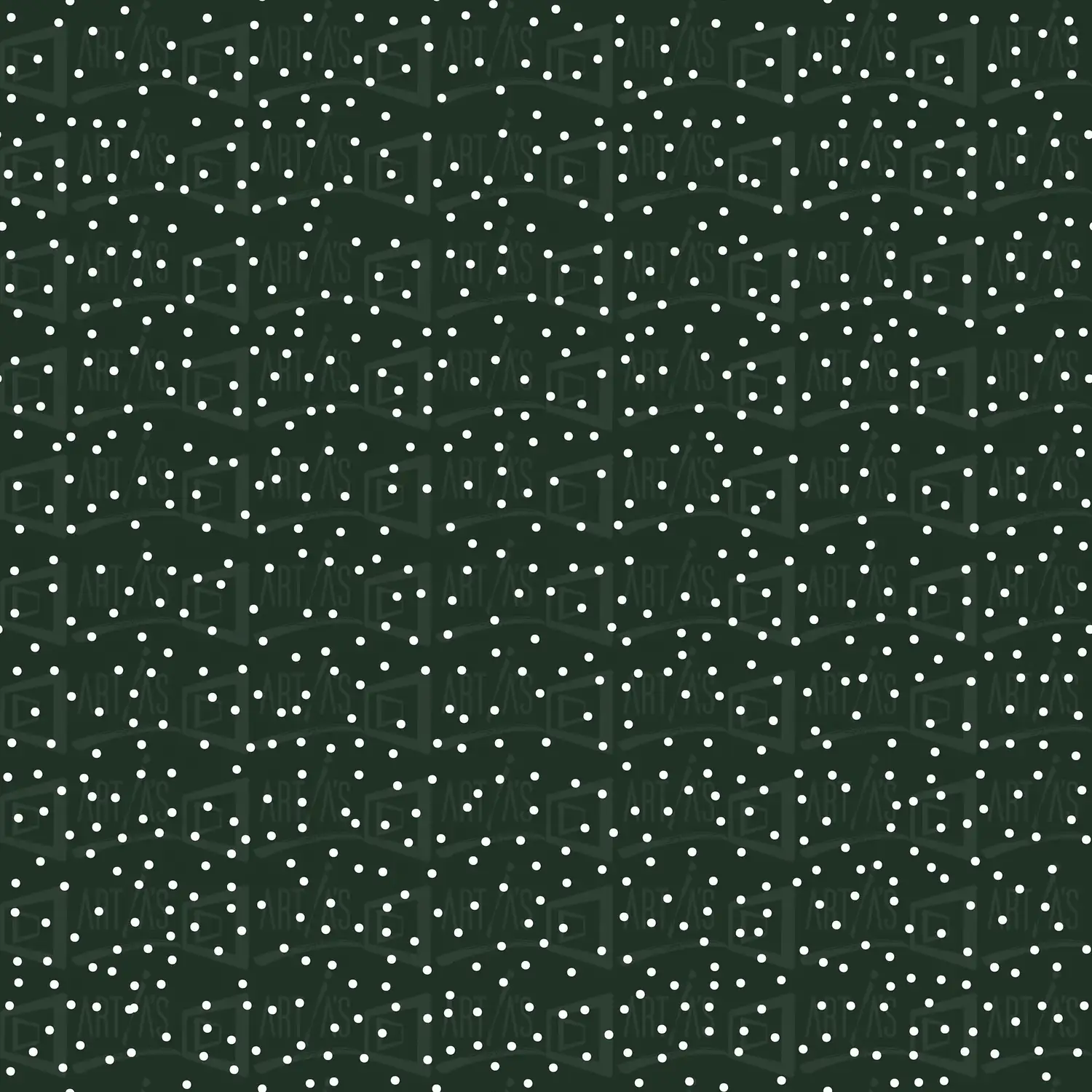 La obra presenta un patrón repetitivo de puntos blancos distribuidos uniformemente sobre un fondo verde oscuro. Este diseño minimalista crea un efecto visual atractivo y contemporáneo, ideal para aplicaciones en textiles, papelería o decoración. La simplicidad del patrón permite su versatilidad en diferentes contextos, destacando la armonía entre el color y la forma.