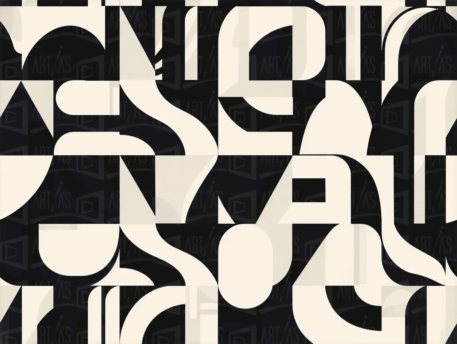 Patrón decorativo de cmposición abstracta en blanco y negro con formas geométricas y líneas fluidas.