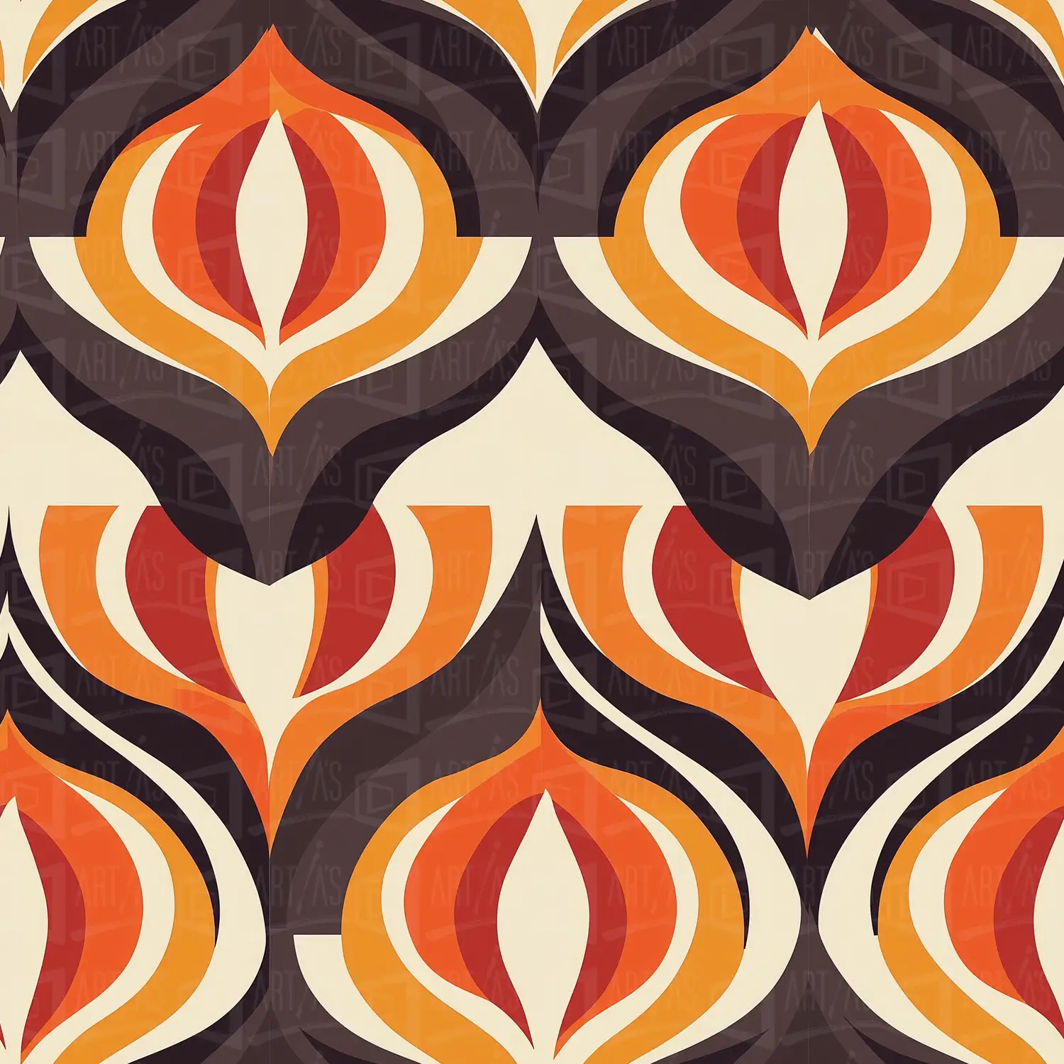 La obra presenta un patrón abstracto que combina formas orgánicas en una disposición repetitiva. Los colores predominantes incluyen tonos cálidos como el naranja y el rojo, contrastando con el negro y el beige. Este diseño evoca una sensación de dinamismo y movimiento, ideal para estudios de diseño y decoración. La interacción entre las formas y los colores crea un efecto visual atractivo, destacando la estética del arte moderno.