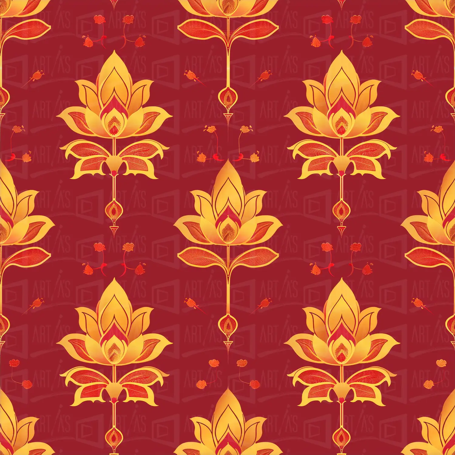 Patrón decorativo con flores de loto en tonos dorados sobre fondo rojo.