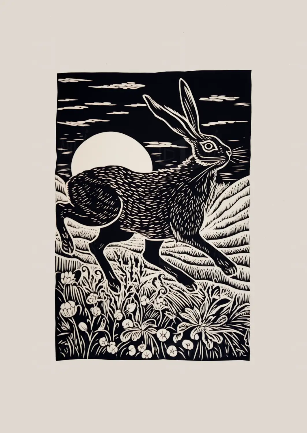 Obra que representa un conejo en movimiento, capturado en un estilo de grabado. El fondo muestra un paisaje con colinas y un sol grande, creando un contraste entre el blanco del conejo y el negro del entorno. La composición destaca la agilidad del animal, rodeado de flores que añaden un elemento natural al entorno. Esta obra refleja la conexión entre la fauna y su hábitat, utilizando líneas definidas y un diseño estilizado.