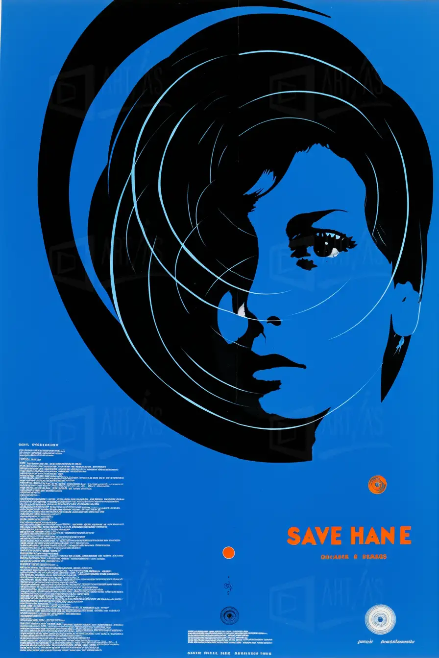 La obra presenta un cartel gráfico que muestra un retrato estilizado de una mujer, con un fondo azul intenso. La figura se destaca por líneas negras que delinean su rostro y cabello, creando un efecto visual dinámico. Elementos circulares en diferentes tamaños y colores complementan la composición, aportando un sentido de movimiento y modernidad. Este diseño gráfico es representativo de la estética contemporánea, fusionando arte y comunicación visual.