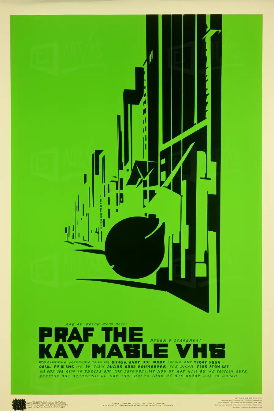 La obra presenta un cartel gráfico que utiliza un fondo verde vibrante, contrastando con elementos arquitectónicos en negro. La composición destaca por su estilo minimalista y su enfoque en la tipografía, que se integra con las formas geométricas. Este diseño es representativo de la estética contemporánea, donde se busca la simplicidad y la claridad visual, capturando la atención del espectador de manera efectiva.