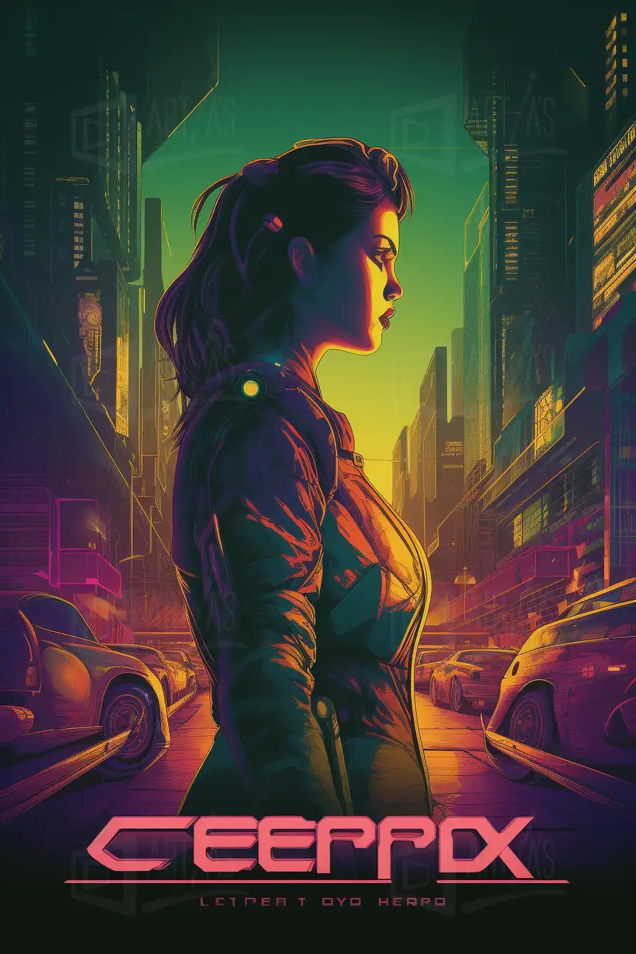 La obra presenta un retrato de perfil de una mujer en un entorno urbano futurista. La figura destaca con un fondo de edificios iluminados y vehículos, creando una atmósfera de ciencia ficción. Los colores vibrantes, como el verde y el rosa, contrastan con las sombras, aportando dinamismo a la composición. La representación sugiere un futuro tecnológico y una narrativa visual intrigante, ideal para explorar temas de identidad y modernidad.