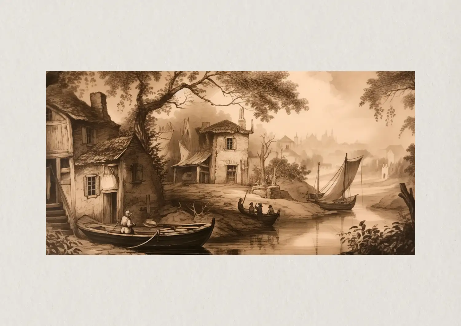 Obra que representa un paisaje rural con casas de campo y un río que fluye suavemente. En la orilla, se observan barcos y figuras humanas que interactúan con el entorno. La atmósfera es tranquila, con árboles que enmarcan la escena y un fondo que sugiere un pueblo lejano. Esta obra captura la vida cotidiana en un entorno natural, destacando la relación entre el ser humano y la naturaleza.