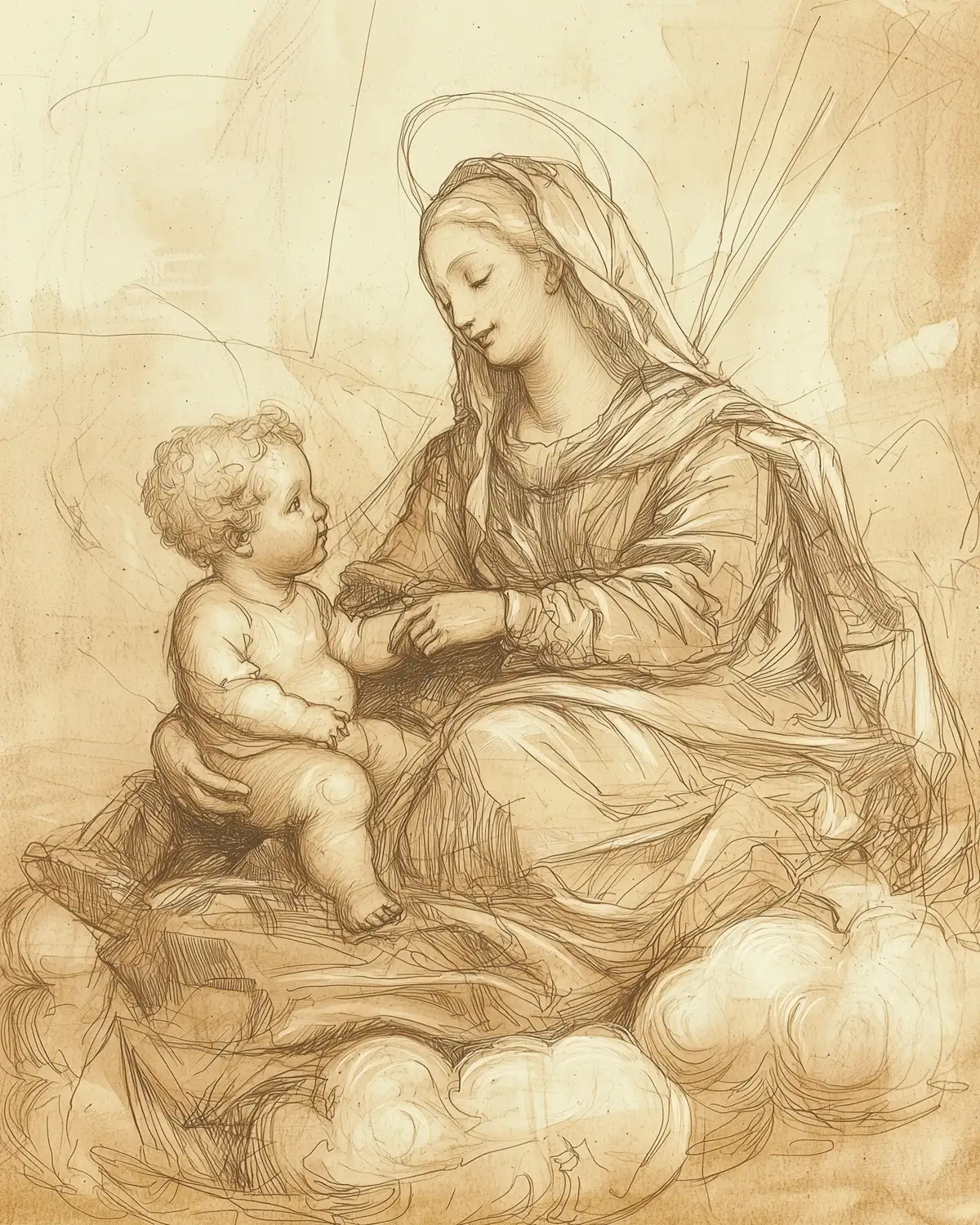 Obra que muestra a la Virgen María sosteniendo al niño Jesús en un ambiente celestial. La figura de María está vestida con ropas tradicionales, mientras que el niño, de aspecto tierno, interactúa con ella. La composición incluye nubes que sugieren un contexto divino. La técnica utilizada resalta los contornos y detalles de las figuras, creando una atmósfera de ternura y devoción. Esta obra refleja la iconografía religiosa típica del Renacimiento, donde se enfatiza la relación maternal entre María y Jesús.