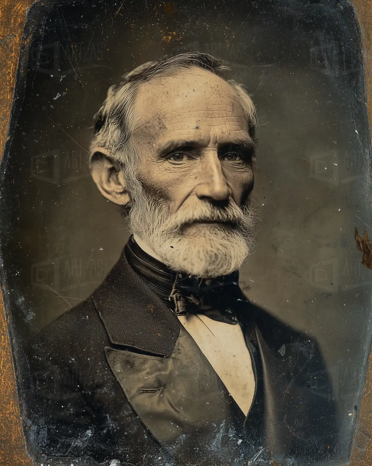 Retrato en tintype de un hombre mayor con barba y cabello canoso, que viste un traje oscuro y una corbata. La obra captura la expresión seria del sujeto, destacando su rostro y la textura de su piel. El fondo es neutro, lo que permite que el enfoque se mantenga en el retratado. Esta técnica fotográfica, popular en el siglo XIX, resalta los detalles del rostro y la vestimenta, ofreciendo una visión íntima de la época.