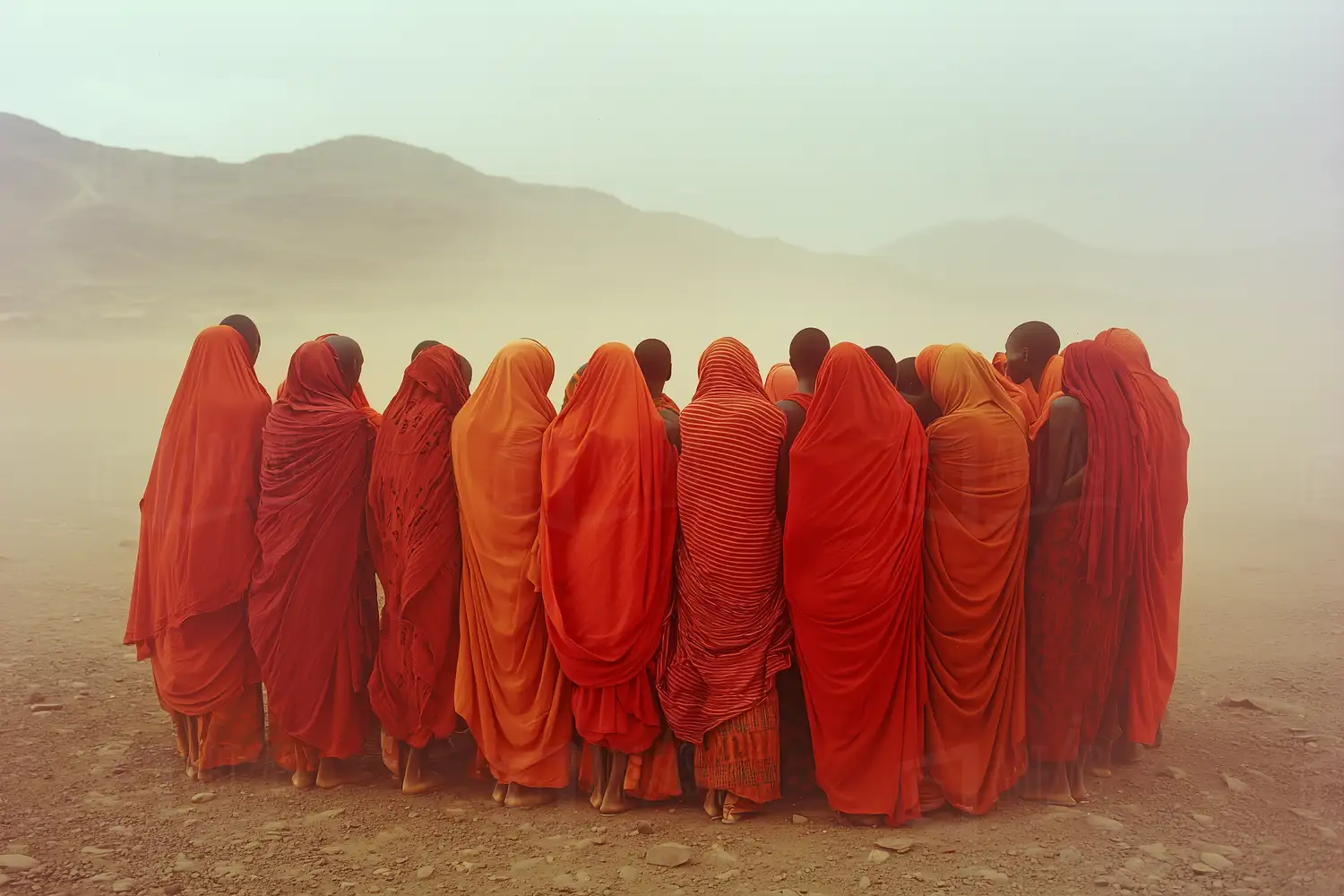 Grupo de personas con vestimenta tradicional en tonos rojos, de espaldas, en un paisaje desértico.