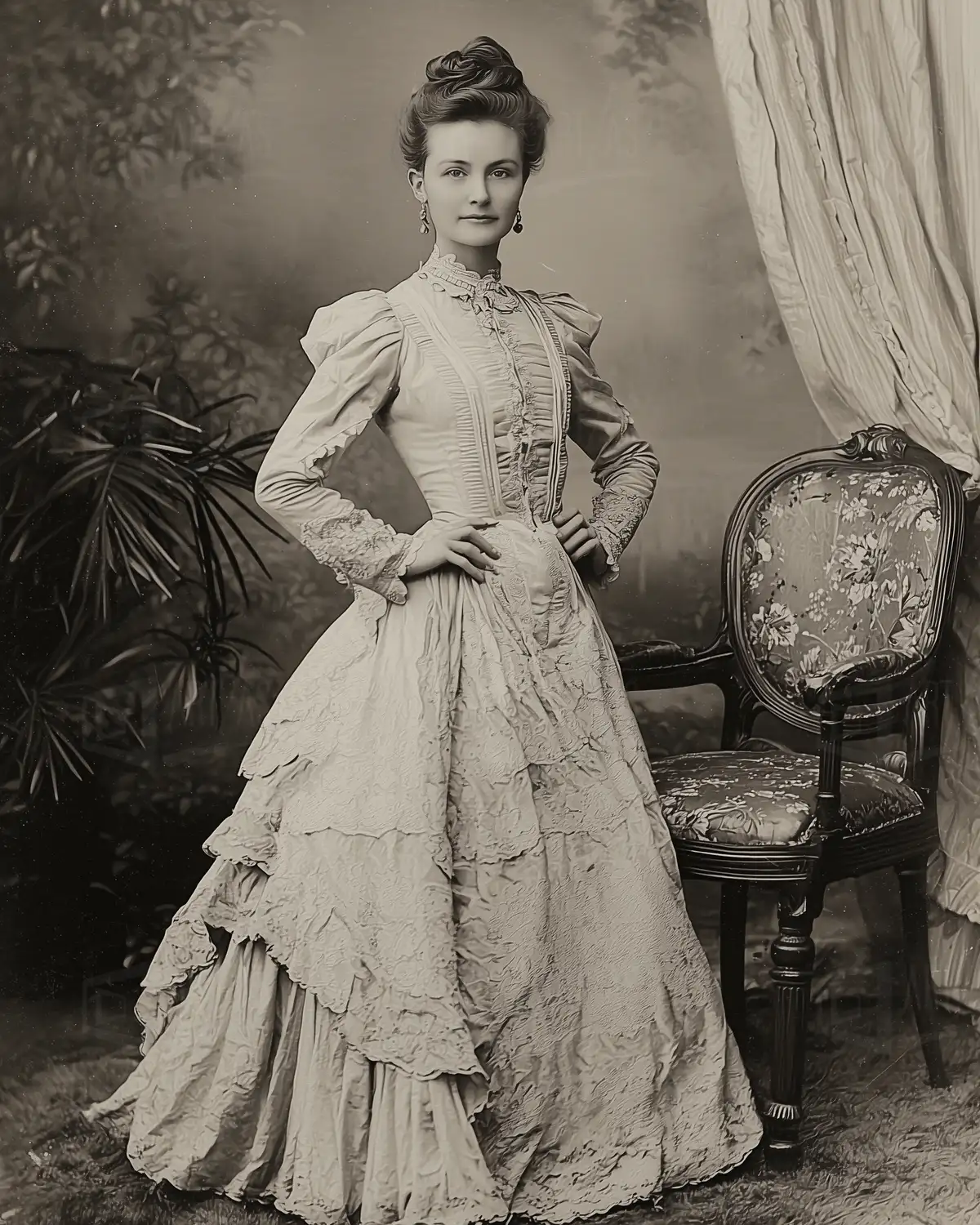 Retrato en blanco y negro de una mujer vestida con un elaborado vestido de época, característico del siglo XIX. La figura se presenta de pie, con una postura elegante y segura, mientras que el fondo muestra un ambiente decorativo que complementa su atuendo. La atención al detalle en el vestido y el peinado resalta la moda de la época, ofreciendo una visión clara de la estética y el estilo de vida de ese período histórico.
