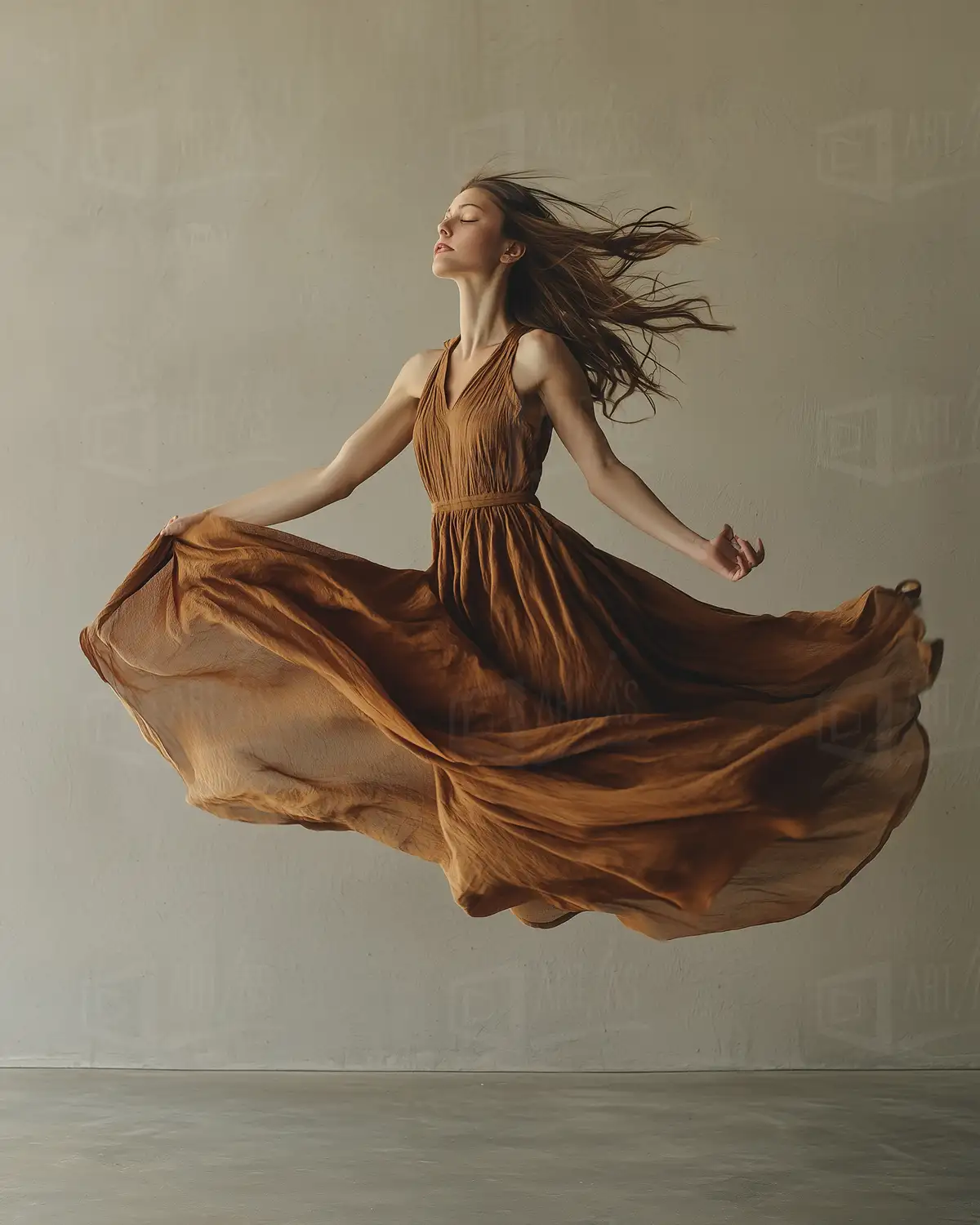 Mujer en movimiento con vestido marrón, fondo neutro.
