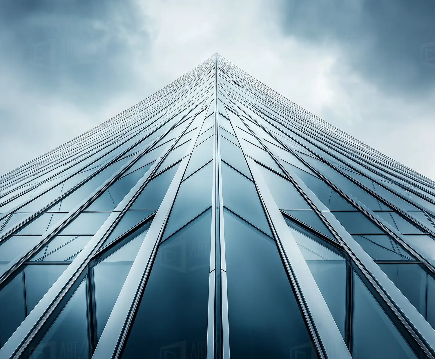 La obra presenta una vista desde el suelo de un rascacielos contemporáneo, destacando su estructura de vidrio y metal. La perspectiva ascendente resalta la geometría del edificio, mientras que el cielo nublado añade un efecto dramático. Esta representación arquitectónica enfatiza la modernidad y la innovación en el diseño urbano, capturando la interacción entre la naturaleza y la construcción humana.