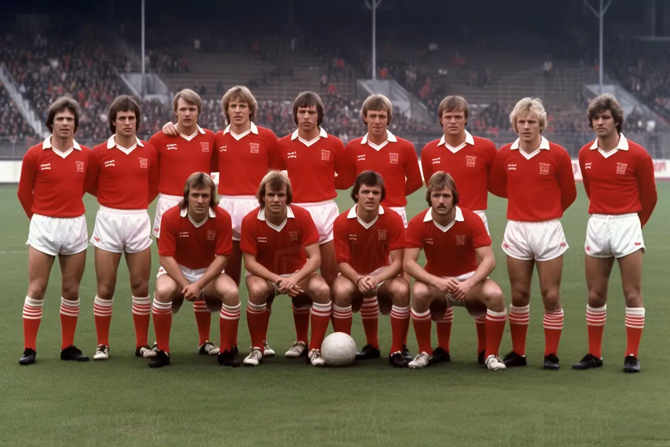 Fotografía de un equipo de fútbol posando en un campo, todos vistiendo uniformes rojos con pantalones cortos blancos. La imagen captura la esencia del deporte en un ambiente de competición, mostrando a los jugadores en una formación organizada. El fondo presenta un estadio con espectadores, lo que añade contexto a la escena. Esta obra refleja la camaradería y el espíritu de equipo característicos del fútbol.