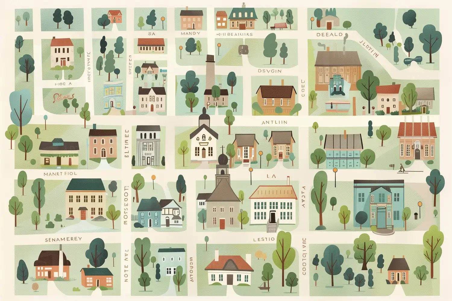 Obra que representa un mapa ilustrado de una ciudad, mostrando diversas casas y árboles dispuestos en un diseño organizado. Las edificaciones presentan diferentes estilos arquitectónicos, mientras que los árboles y elementos urbanos añaden un toque de vida al entorno. La paleta de colores suaves y la disposición clara de los elementos hacen que esta obra sea atractiva y fácil de interpretar, ideal para estudios de urbanismo o diseño gráfico.