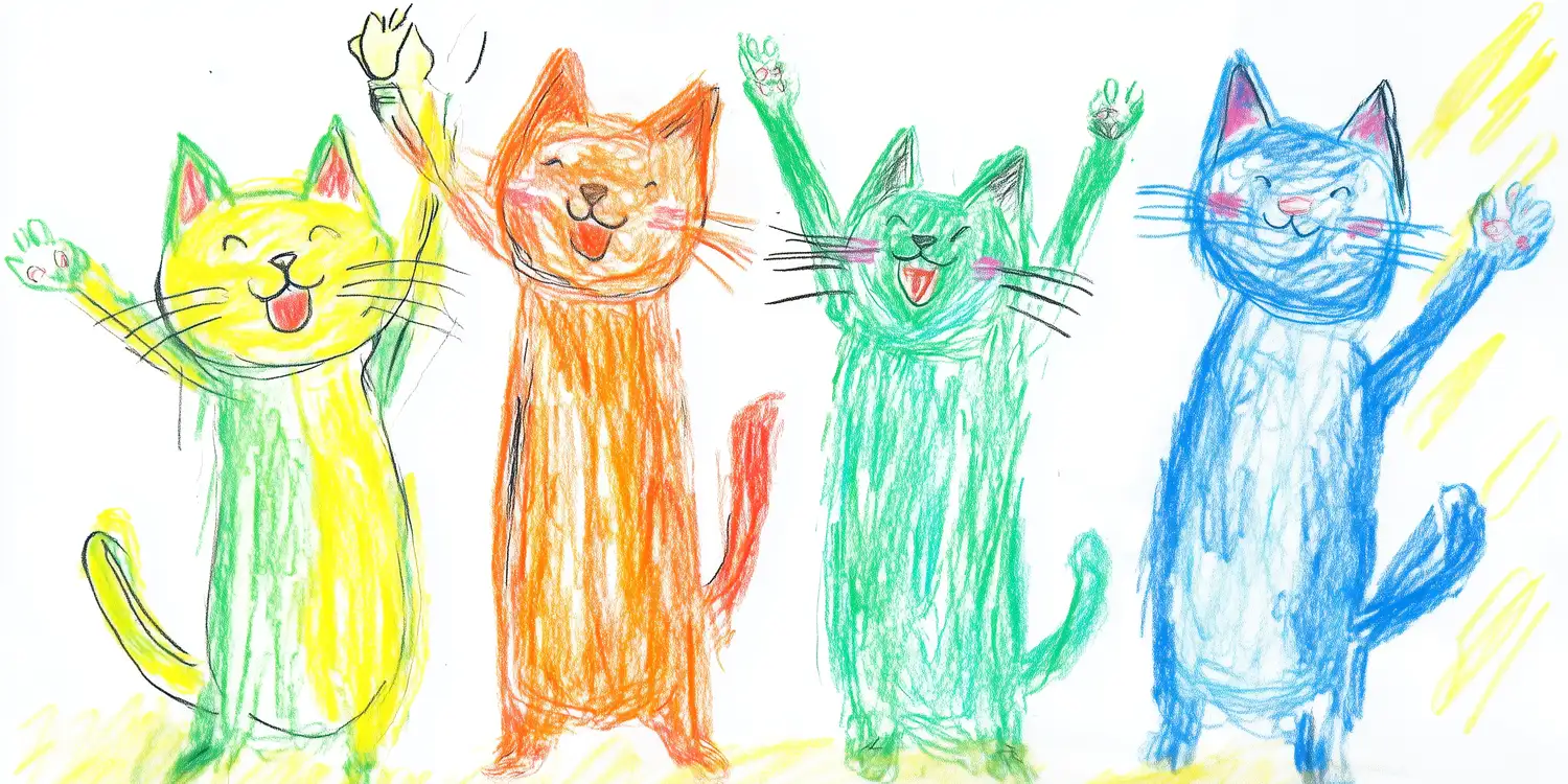 Obra que representa cuatro gatos de diferentes colores, cada uno mostrando una expresión alegre y levantando las patas. Los gatos están dibujados con trazos gruesos y colores brillantes, creando un ambiente festivo y divertido. La composición destaca la diversidad de colores y la energía de los felinos, capturando la esencia de la alegría infantil en el arte. Este dibujo es un ejemplo de la creatividad y la imaginación en la representación de animales.