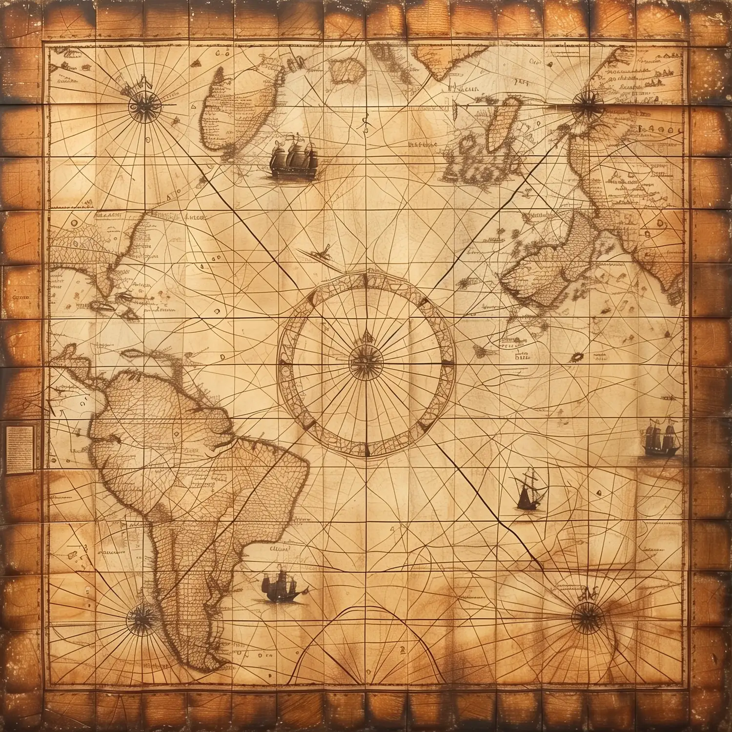 La obra representa un mapa antiguo del mundo, destacando rutas de navegación y detalles geográficos. Incluye ilustraciones de barcos y compases, así como líneas que indican trayectorias marítimas. Este mapa es un testimonio de la exploración y el comercio marítimo, reflejando la importancia de la navegación en la historia. Su diseño y detalles muestran la habilidad cartográfica de la época, siendo un recurso valioso para entender la geografía histórica.