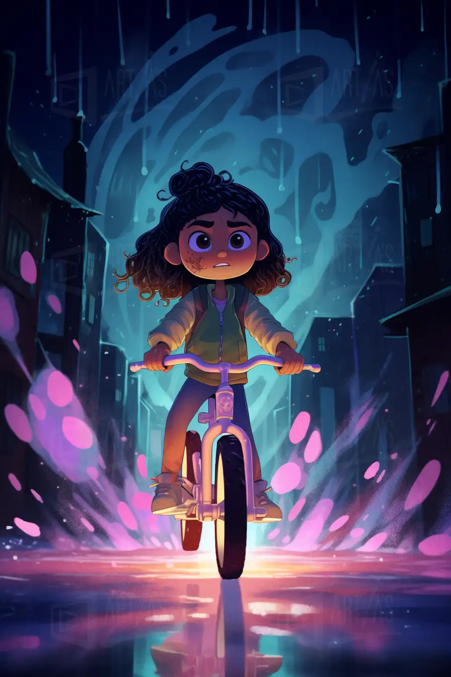 Obra que representa a una niña montando una bicicleta en una calle iluminada por luces de colores en un ambiente lluvioso. La escena captura la esencia de la infancia y la aventura, con un fondo que muestra edificios oscuros y un cielo dramático. Los reflejos en el suelo mojado añaden dinamismo a la composición, mientras que las gotas de lluvia y las luces crean una atmósfera mágica y vibrante, ideal para atraer la atención de los espectadores.