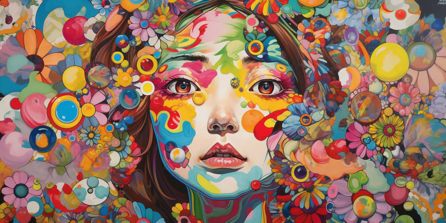 Retrato de una mujer rodeada de flores y formas coloridas.